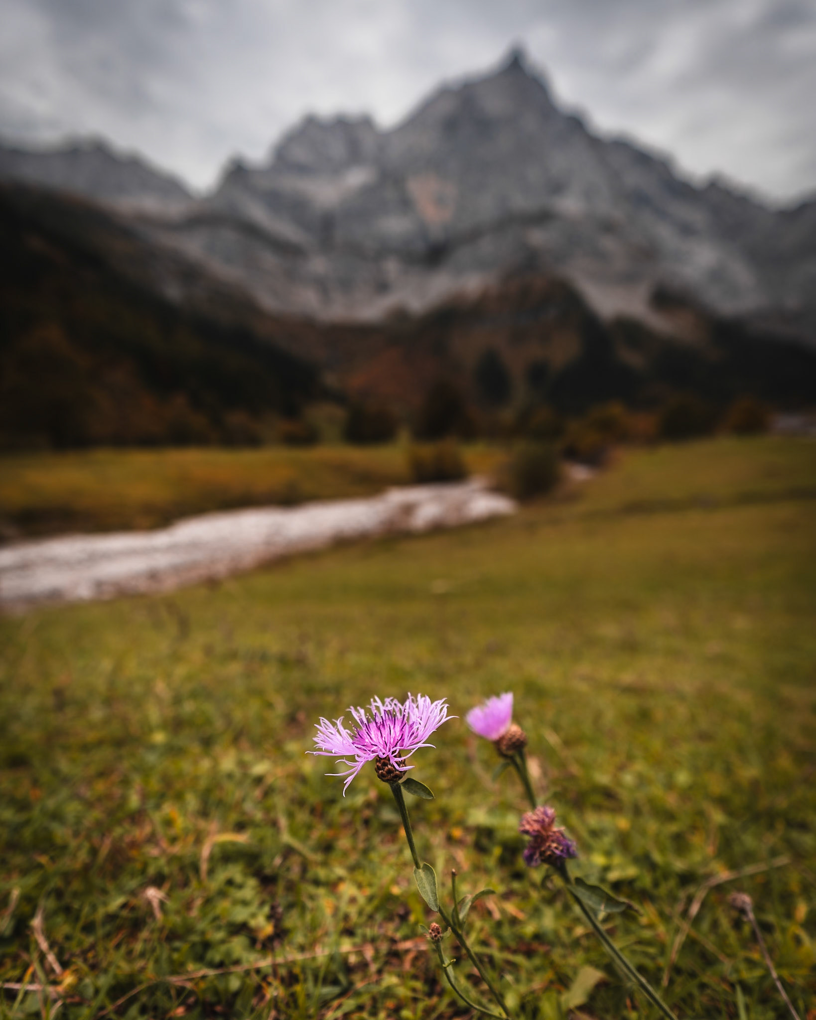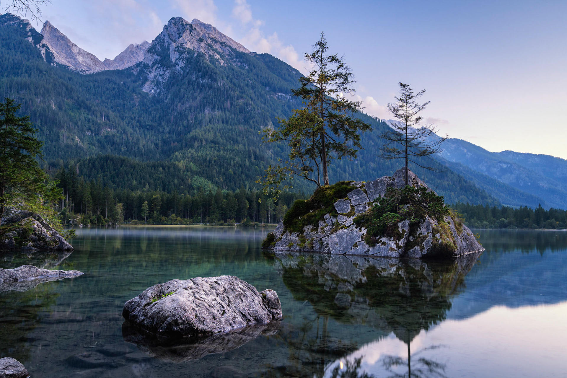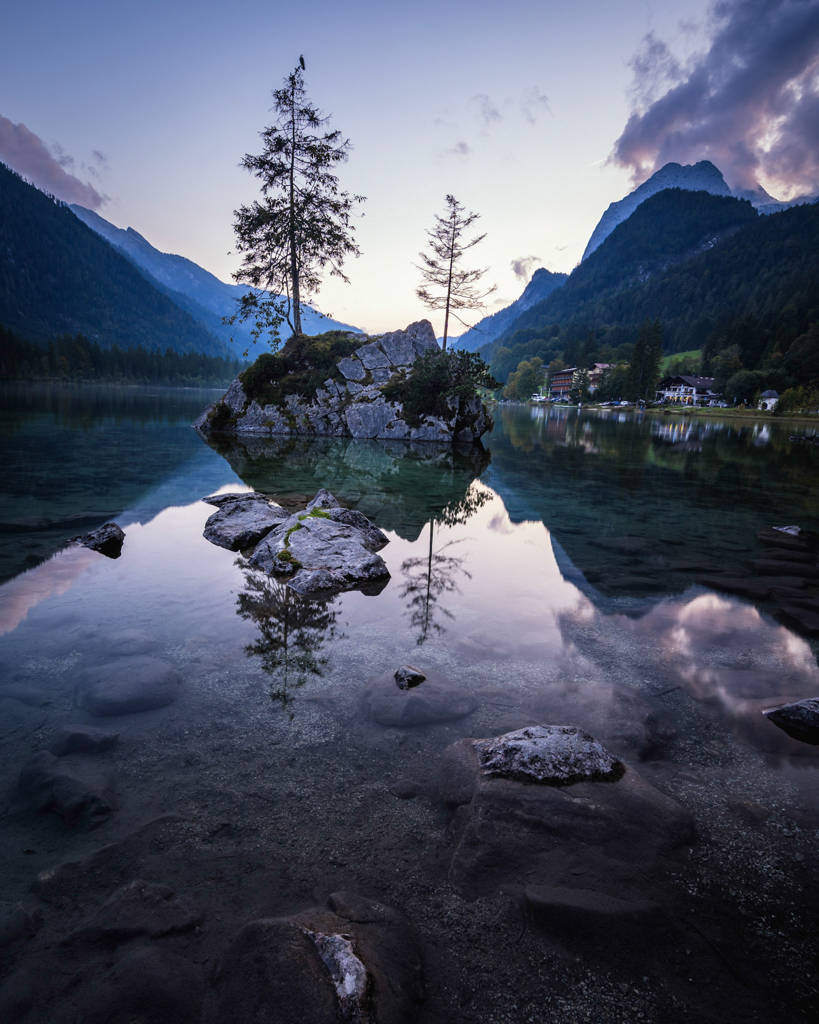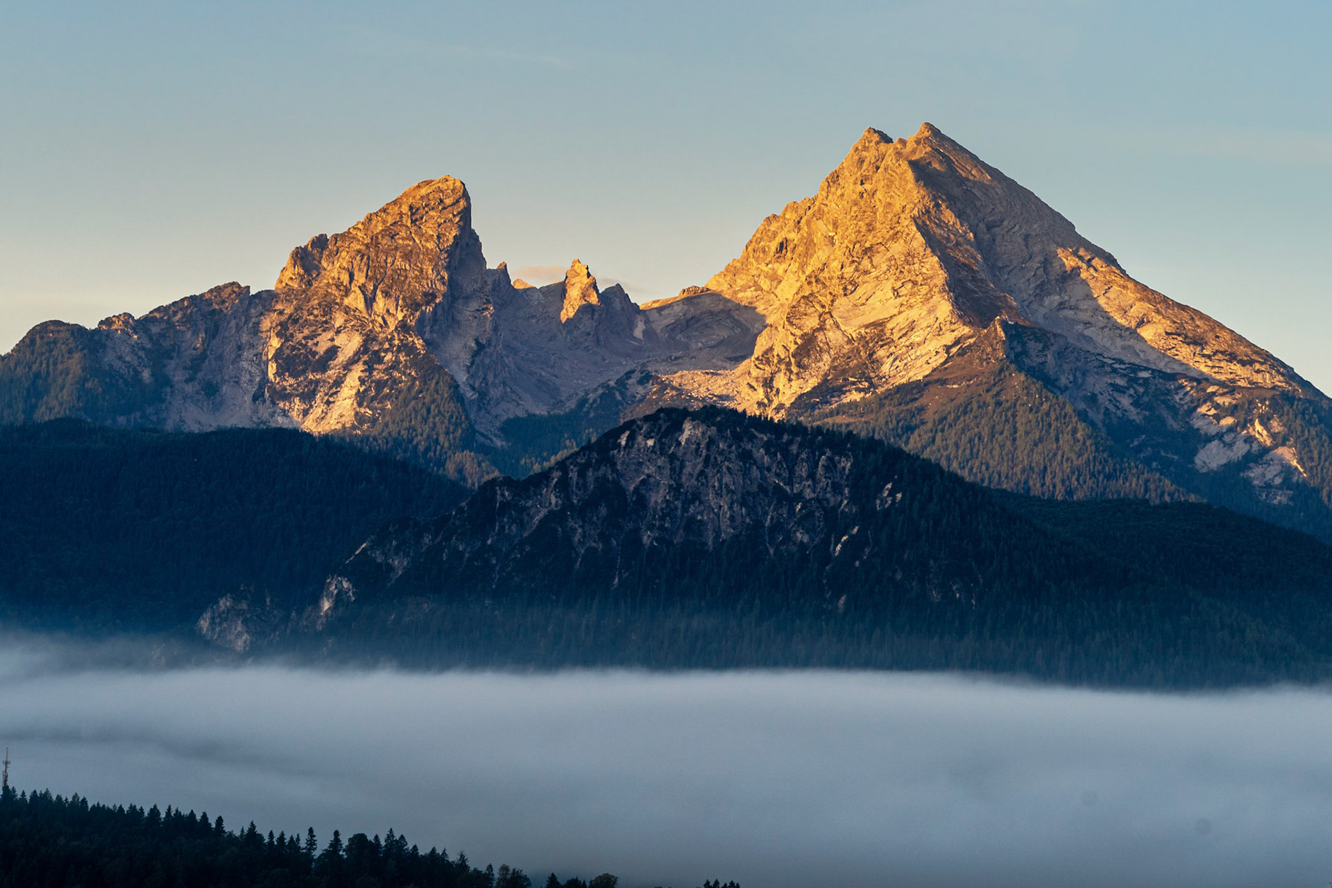 Im Hintergrund strahlt der Sonnenaufgang den Watzmann an.