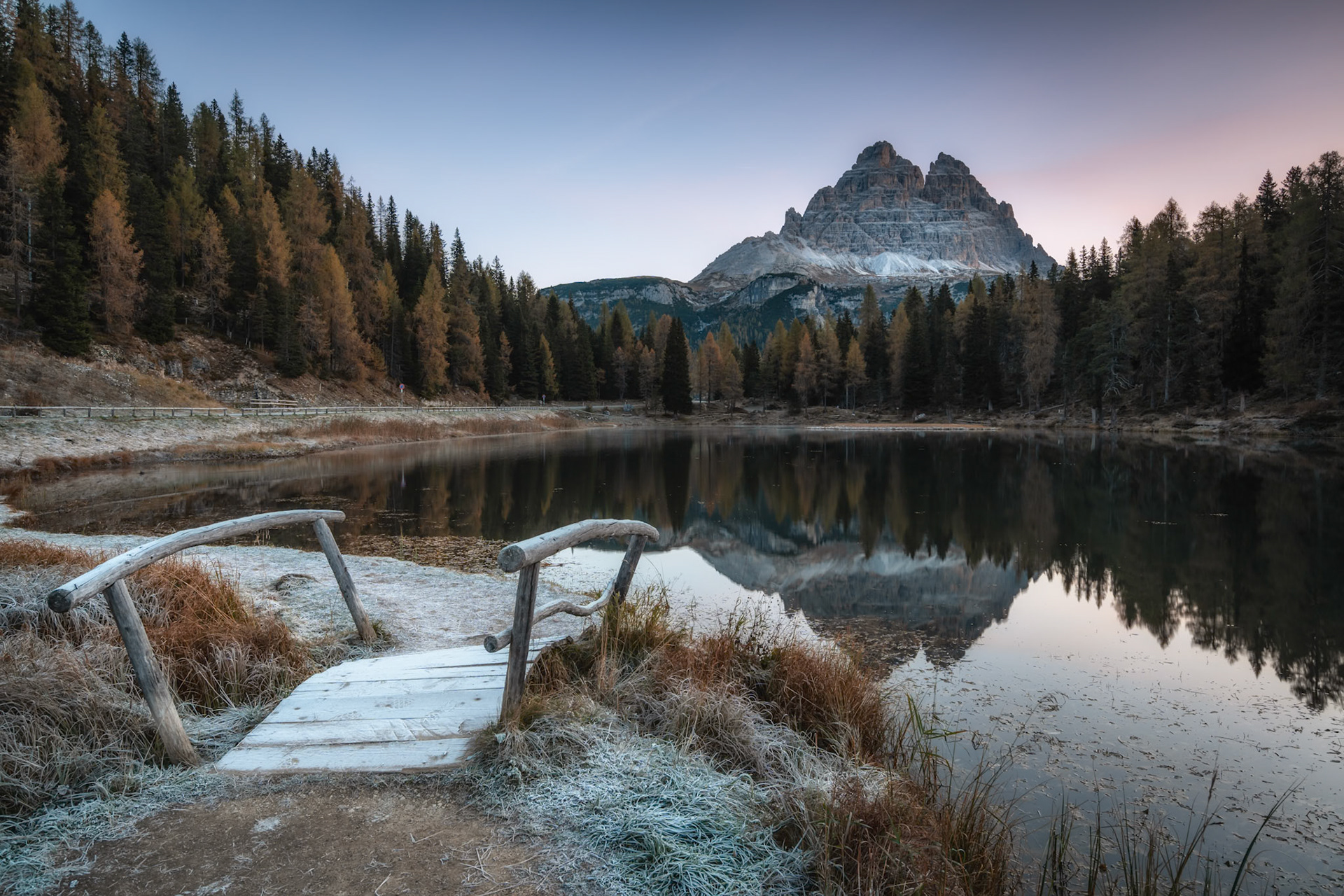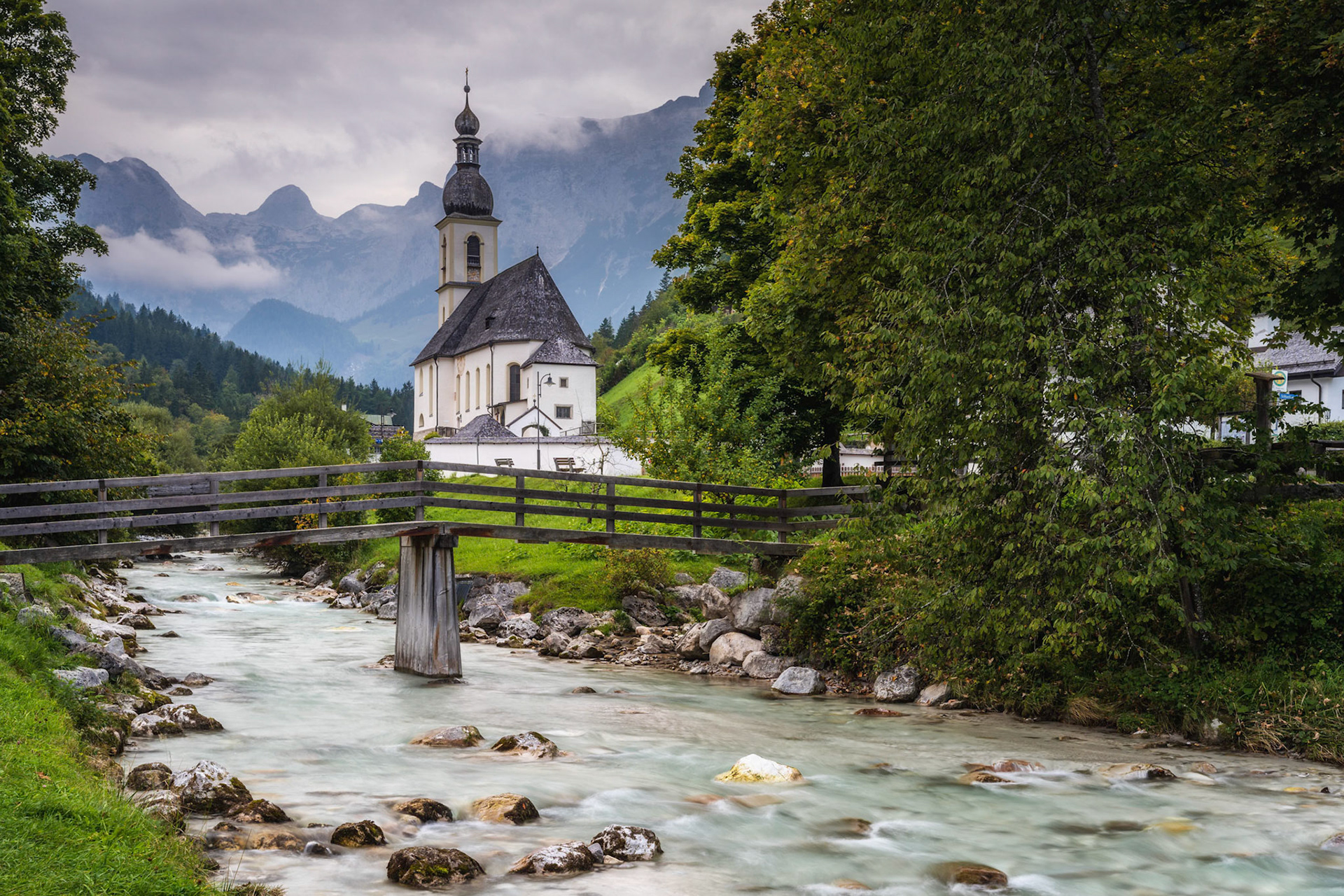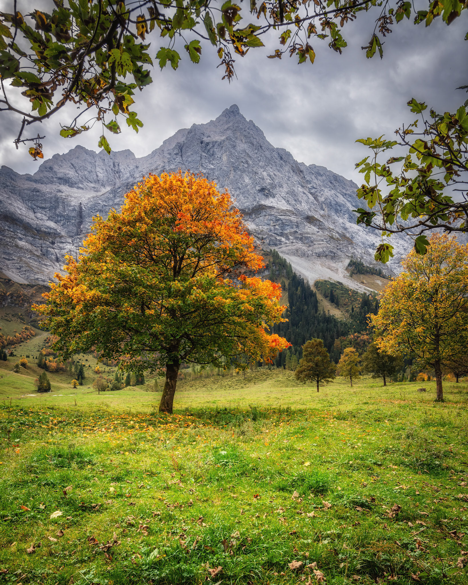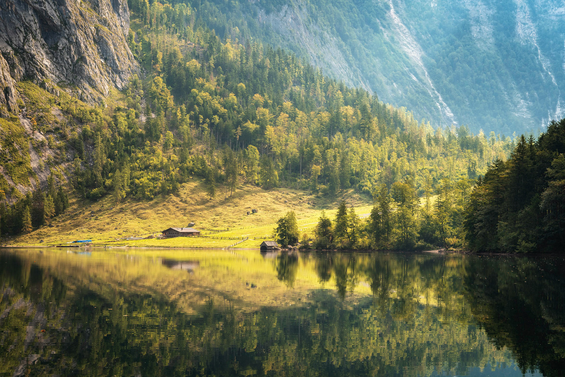 Im Hintergrund strahlt der Sonnenaufgang den Watzmann an.