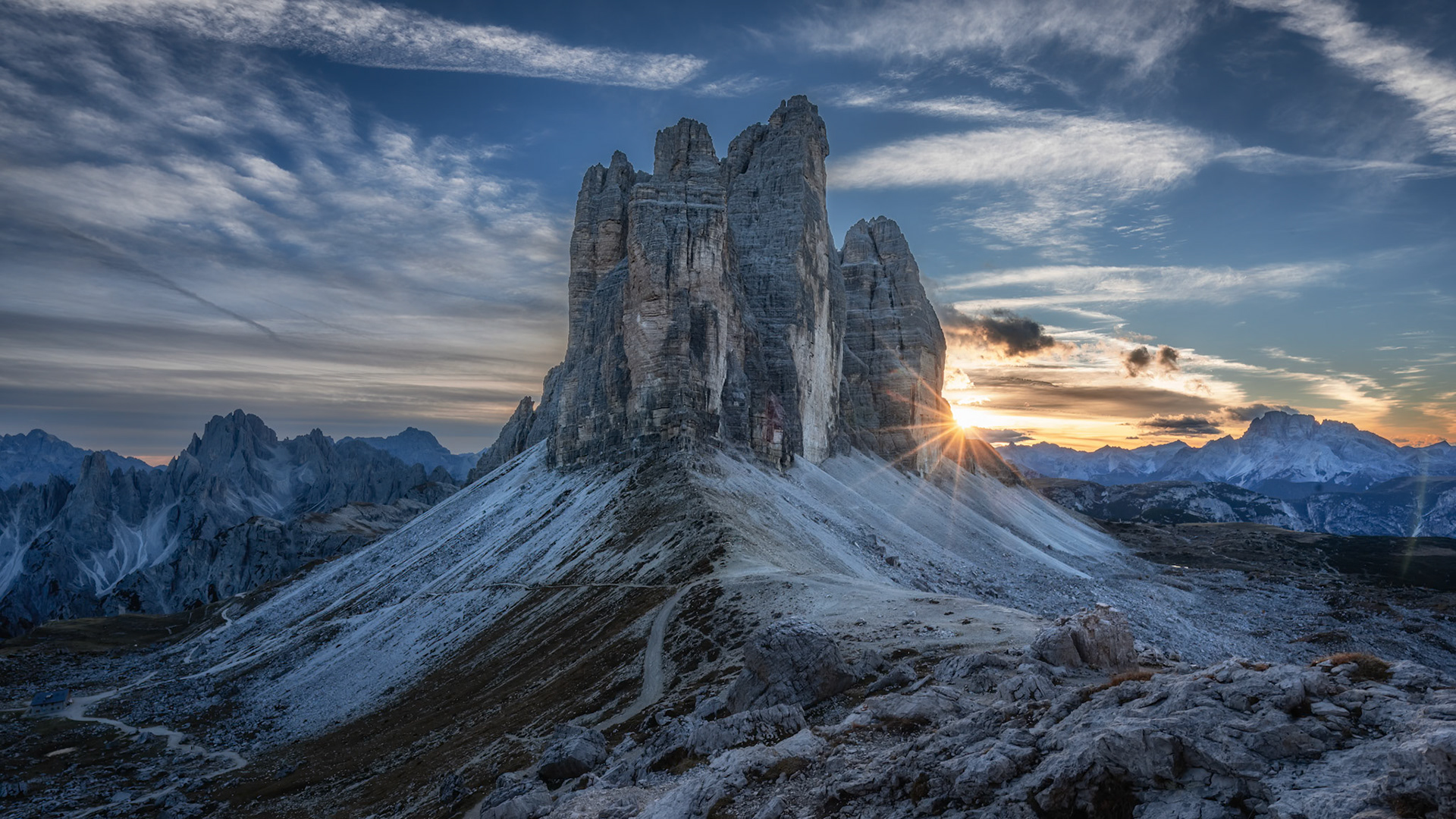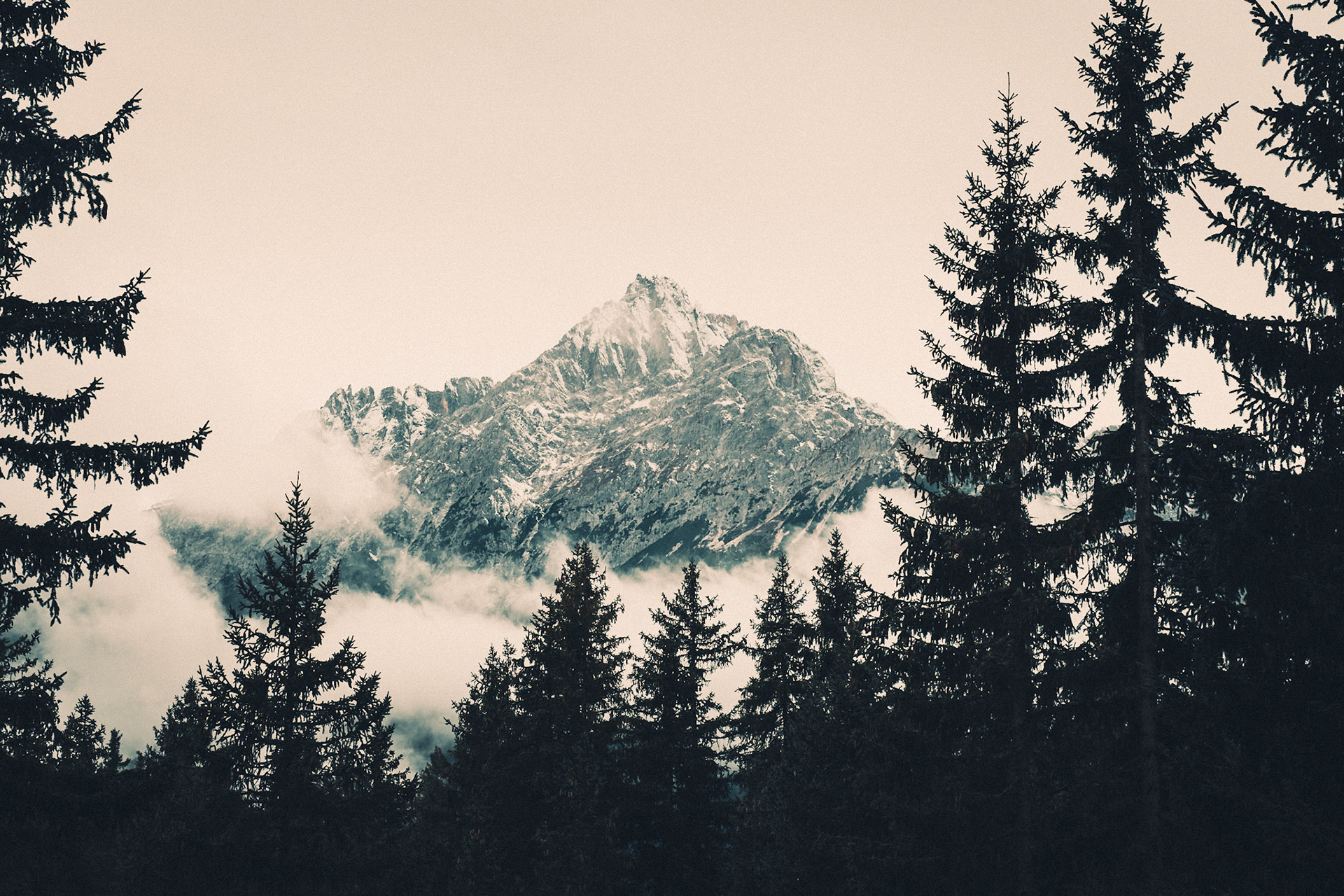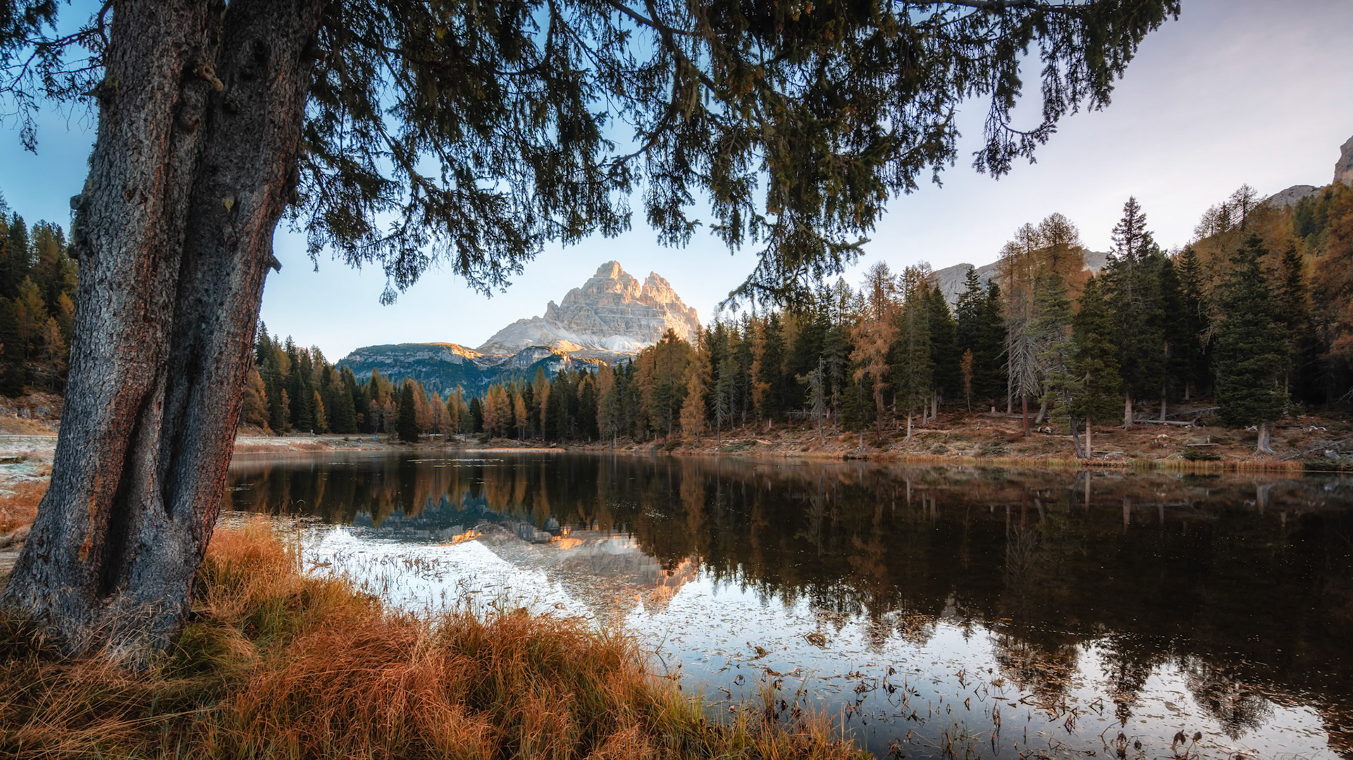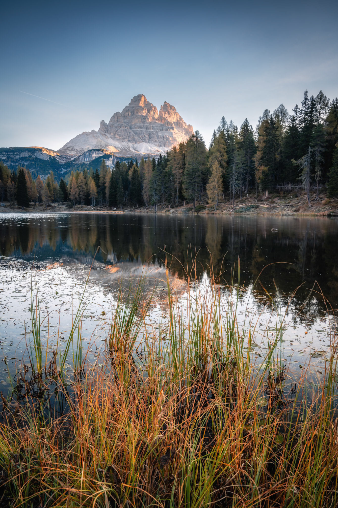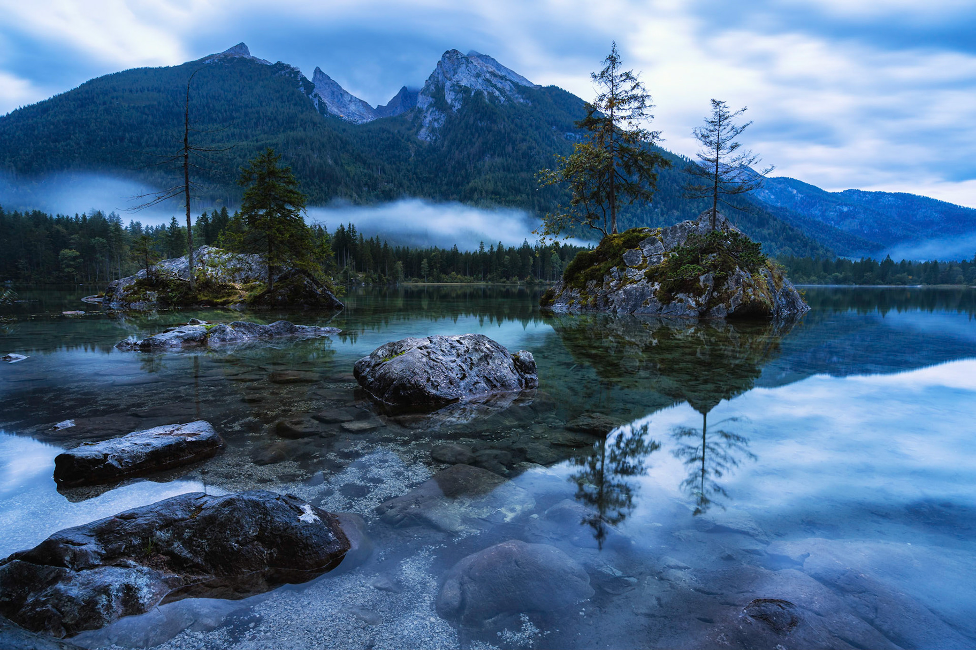 Im Hintergrund strahlt der Sonnenaufgang den Watzmann an.